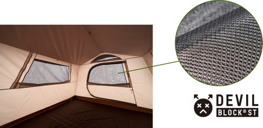 インナーテントには大型のメッシュ窓と、前後上部にベンチレーションが付いているため、風通しも抜群。優れた通気性で結露を防ぎ、快適な室内環境を保つ。メッシュには高機能の「デビルブロックST」を採用しており、UV-CUT率と遮光率は通常の約1.5倍で、強い日差しを和らげながらも細かいメッシュが小さな虫の侵入を防ぐ。