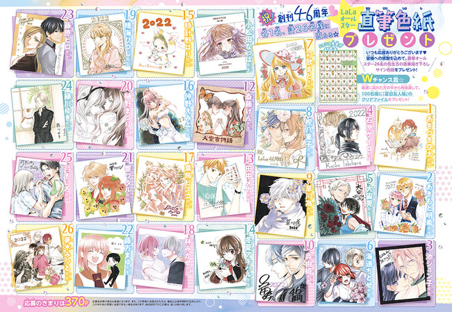 『LaLa』は今号で創刊46周年を迎えます。いつも応援してくださる皆様への感謝を込めて、豪華オールスター26名の先生方の直筆描き下ろしサイン色紙をプレゼント! 各作品ごとに1名、計26名様に当たります。皆様のご応募お待ちしております。応募方法などの詳細は『LaLa』9月号誌面を必ずご確認ください。