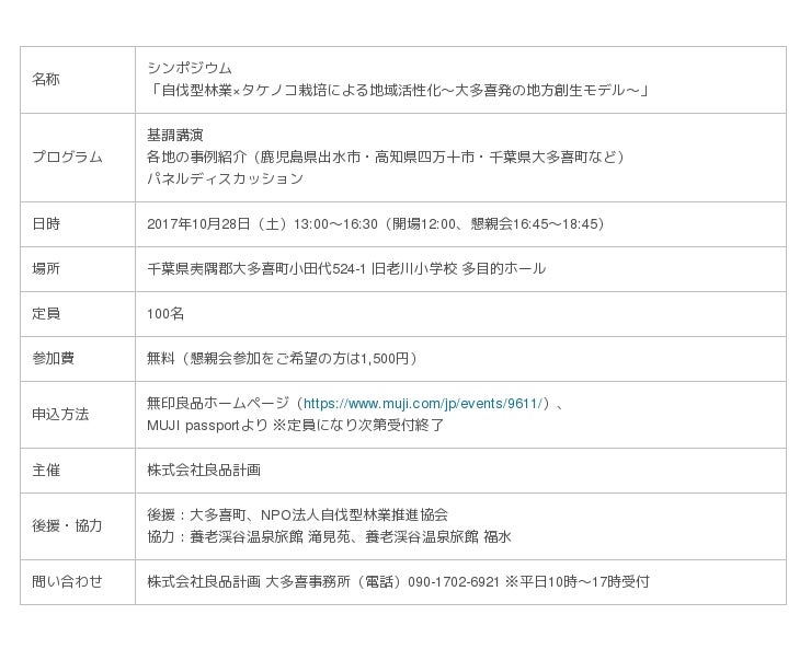 株式会社良品計画(東京都豊島区/代表取締役社長 松﨑曉)は、10月28日(土)に千葉県大多喜町にある旧老川小学校にて、遊休山林・竹林の活用による地方創生について考えるシンポジウム「自伐型林業×タケノコ栽培による地域活性化~大多喜発の地方創生モデル~」を開催いたします。