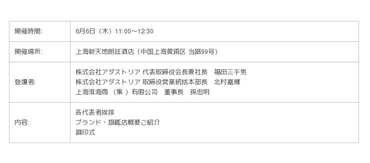 「Play fashion!」をコーポレートスローガンに掲げる株式会社アダストリア(本部:東京都渋谷区渋谷2-21-1、代表取締役 会長兼社長:福田三千男)は、2019年末に予定するniko and ...上海グローバル旗艦店の出店に向け、調印式を2019年6月6日(木)に上海新天地朗廷酒店(中国上海黄浦区马当路99号)にて行いました。