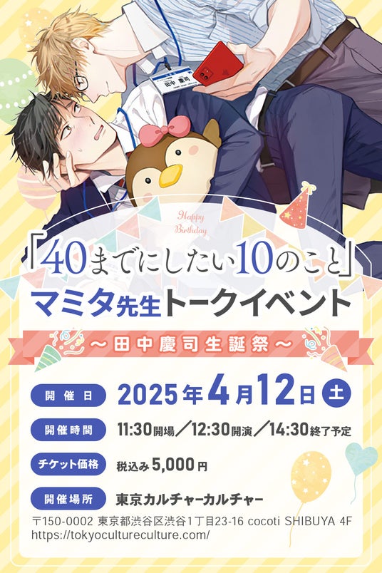 株式会社リブレ(本社:東京都新宿区、代表取締役社長:是枝由美子)は、2025年4月12日(土)「40までにしたい10のこと」マミタ先生トークイベント~田中慶司生誕祭~を東京カルチャーカルチャーにて開催いたします。https://tokyocultureculture.com/event/general/35876