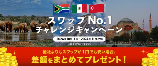 2024年10月1日(火)~2024年11月29日(金)の期間中、FX口座におけるトルコリラ/円、メキシコペソ/円、南アフリカランド/円の高金利3通貨ペアの新規買いポジションに対して、スワップポイントが他社より1円でも安い場合は、差額をキャンペーン期間終了後にまとめてプレゼントいたします。
