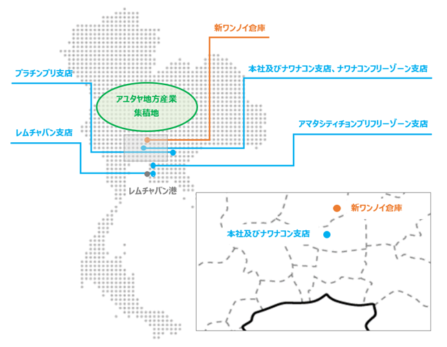 ワンノイ地区は消費財メーカーおよび大手小売・流通企業などが多く進出しており、この需要に応えるべく、新倉庫を設立します。本倉庫は、工業団地が集積しているアユタヤ県から、タイの玄関港であるレムチャバン港を結ぶ国道1号線の物流動線上に位置し、輸送コストや温室効果ガス排出の抑制が期待できる立地となっています。