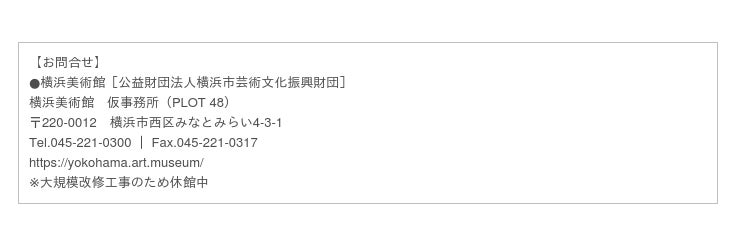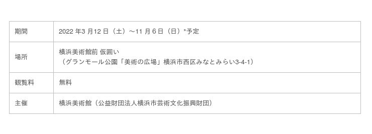 大規模改修工事のため休館中の今回は、その特別版となる「Wall Project」として、横浜美術館正面のグランモール公園「美術の広場」に面した仮囲いで、2 回にわたり若手アーティストの創作を紹介します。
