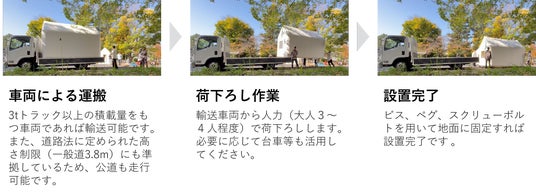 輸送車両から重機を使わずに人力(大人3~4人程度)で荷下ろしができ、ビス、ペグ、スクリューボルトを用いて地面に固定すれば設置完了するため、届いたその日からすぐに利用を開始できます。設置するだけで快適なプライベート空間を実現する手軽さにより、グランピング施設などの宿泊事業だけでなく、ワークスペースなどのレンタルスペース、集中できる個人の趣味空間、さらには災害時の緊急避難先まで、幅広い用途に対応します。