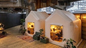 インスタントハウスは、テントシートを空気で膨らませながら、内側から断熱材を吹き付けて形成する構造物で、断熱性・遮音性に優れ、簡便かつ短時間で設置できる点が特徴です。