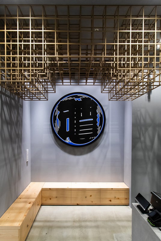 店内には、ひときわ目を引くアートワークも設置。日本の伝統的な「江戸文字」を現代アートとして再解釈するアーティスト「SNEAKERWOLF」が手掛けています。銀座の新たなモニュメントとなるよう、「カンジグラフィ」で制作された“atmos”と、『世界には愛が足りない』というメッセージから生まれた新作“LOVE”を無数の提灯をイメージした展示が際立たせています。