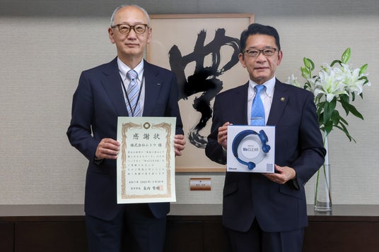 豊中市は、株式会社ムトウ(本社:北海道札幌市北区)から企業版ふるさと納税による寄付として、骨伝導集音器「WeCLEAR」21台の寄贈を受け、長内市長から感謝状を贈呈しました。