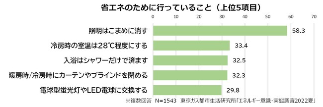 節約行動を実践する人の割合も高まり、行動の上位は、「照明をこまめに消す(58.3%)」「冷房は28℃程度(33.4%)」「入浴はシャワーだけで済ます(32.5%)」でした。