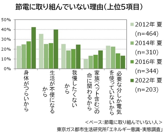 節電・ガスの節約に取り組んでいない人はその理由として、「身体がつらい」「生活が不便になる」ことをあげています。