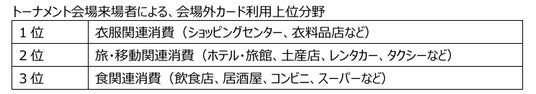 続いて旅・移動関連および食関連の消費が上位に並び、大会を訪れたギャラリーの皆様が観戦終了後に、会場周辺及び近隣観光地の宿泊施設や飲食店を利用された事が伺えます。