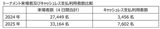 2024年大会と比較したところ、2025年大会はキャッシュレス手段利用者が、約2.2倍となりました。この結果は、昨年比で来場者数が増加した事に加え、オールキャッシュレス化により昨年大会では現金での支払いが多かった少額決済が、キャッシュレス決済にシフトした事が要因と考えられます。