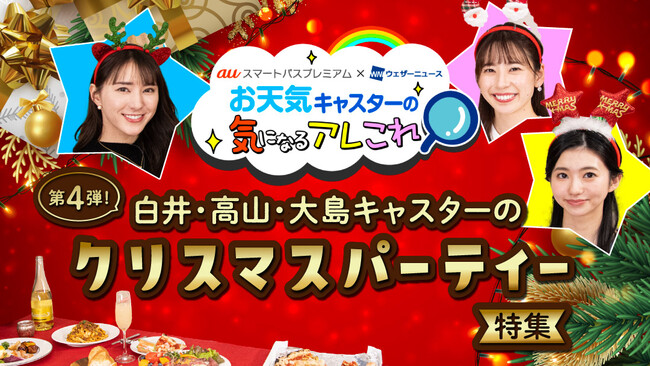 今回は、最新の気象・地震情報を24時間365日生放送でお伝えする動画番組「ウェザーニュースLiVE(ライブ)」に出演している白井ゆかりキャスター、高山奈々キャスター、大島璃音キャスターがフードデリバリーアプリ「menu」を利用してクリスマスパーティーを楽みながら、auスマートパスプレミアムの魅力とおトクな活用方法を紹介します。3人はピザやステーキ、ローストビーフなど、クリスマスならではの美味しそうな料理の数々を注文します。auスマートパスプレミアム会員なら配送料が何度でも無料なので、パーティーシーズンに繰り返し使えることに感心していました。これらの模様は動画でもお楽しみいただけます。さらに、特集公開を記念したプレゼントキャンペーンも実施します。