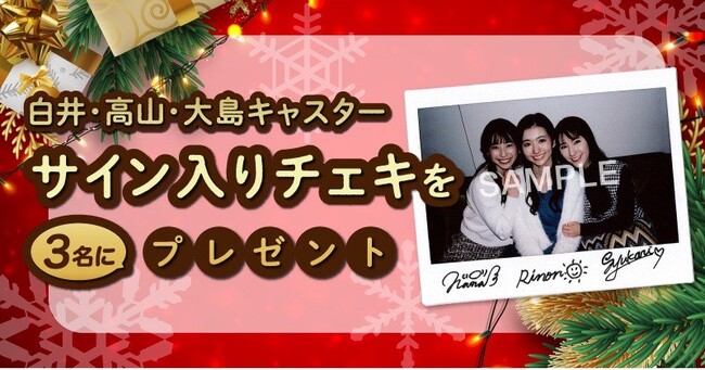 内容:auスマートパスTwitter(@smartpass_au)をフォローし、12月21日に投稿される対象のツイートをリツイートいただいた方の中から抽選で3名の方に白井・高山・大島キャスターのサイン入りチェキをプレゼント。