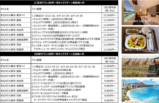 H.I.S.ホテルホールディングス株式会社(本社:東京都港区、以下HIS.H.H.)は株式会社エイチ・アイ・エス(本社:東京都港区、以下HIS)が展開する「オンライン体験ツアー」とコラボレーションし、変なホテルの客室で「世界一周旅行」疑似体験ができる“世界一周ライブツアー付プラン”を本日3月1日(火)より販売開始いたします。