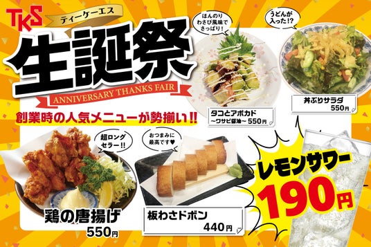 国内約230店舗、海外2店舗、業態数約90の飲食店を展開するGYRO HOLDINGS株式会社(本社:新宿区西新宿、代表取締役社長:根本 寿一)の事業会社である株式会社ティーケーエス(本社:新宿区西新宿、代表取締役社長:斎藤浩司)は、お客様の日頃のご愛顧への感謝の気持ちをこめて、寿司屋や居酒屋などの直営20店舗で5月8日(水)より『生誕祭』を開催いたします。