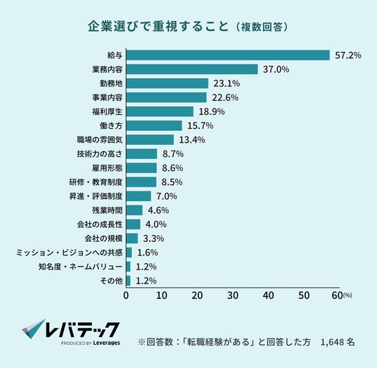 転職先の企業選びで重視した条件は、3年連続「給与(57.2%)」となりました*1。