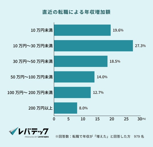 また、直近の転職による年収の変化については「増えた」が59.4%と、約6割のIT人材が実際に転職による年収アップを実現していることが分かりました。年収の増加幅は「10万円~30万円未満(27.3%)」が最も多いものの、「100万円以上」の増加も約2割存在し、転職によって大幅な年収アップを実現しているケースも見受けられます。