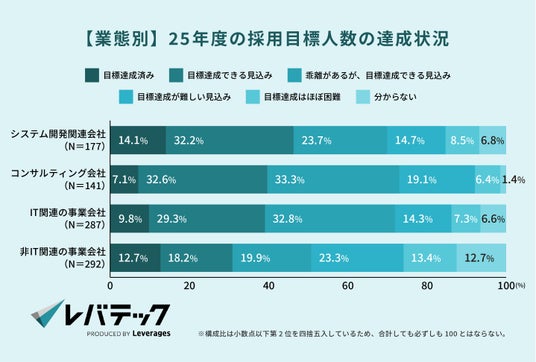 企業別にみると、システム開発やIT関連の事業会社では過半数の企業が順調に採用を進めているのに対し、非IT関連の事業会社では進捗が乖離している企業や達成が難しい企業の割合が比較的高く、業態によっても採用目標の達成状況に差があることがうかがえます。