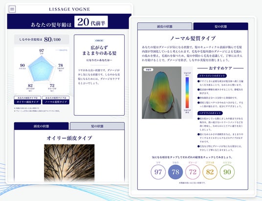 「KAMI-TECH」の導入と同時にリニューアルした「LISSAGE VOGNE」は、お客さまにご好評いただき、売上やリピート状況が好調に推移しています。購入者アンケートからは、パーソナライズされたアイテムを選択できることが購入の決め手として上位に挙げられており、AIによる的確なカウンセリングによってお客さまの髪とアイテムとの理想的なマッチングに貢献しているということが想定されます。