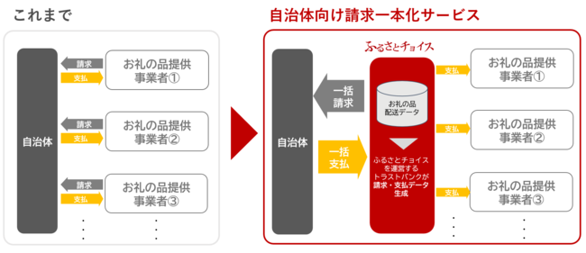 国内最大級のふるさと納税総合サイト「ふるさとチョイス」を企画・運営する株式会社トラストバンク(本社:東京都渋谷区、代表取締役:川村憲一、以下「トラストバンク」)は本日7月1日、自治体に対して、ふるさと納税のお礼の品に関する自治体の支払関連業務を代行する「自治体向け請求一本化サービス」を開始します。