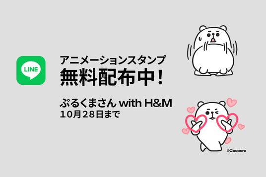 ファッションとクオリティを最良の価格でサステナブルに提供するH&M(エイチ・アンド・エム ヘネス・アンド・マウリッツ・ジャパン)は、人気キャラクター「ぷるくまさん」とコラボレーションした、LINEアニメーションスタンプ「ぷるくまさん with H&M」を無料配信いたします。本アニメーションスタンプは、10月1日(火)~10月28日(月)の期間中、H&MのLINE公式アカウントを友だち追加していただくと、無料でダウンロードいただけます。