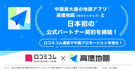 店舗向け集客一元化プラットフォーム「口コミコム」および国内最大級のインバウンド業界メディア「訪日ラボ」を運営する株式会社mov(代表取締役:渡邊 誠、本社:東京都渋谷区、以下 mov)は、中国最大手のIT企業アリババグループが運営し、同国内で最も利用されている*1地図アプリ「高徳地図(高徳地图/ガオドゥマップ/Amap、以下 高徳地図)」と、日本国内企業として初*2となる公式パートナー契約を締結し、口コミコムと連携(以下、本業務提携)を開始したことをお知らせいたします。