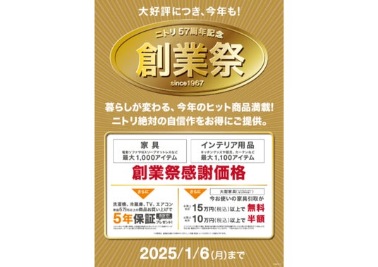 支えていただいたお客様への感謝を込めて、2024年11月29(金)から2025年1月6日(月)までの期間で「ニトリ57周年記念創業祭」を開催。