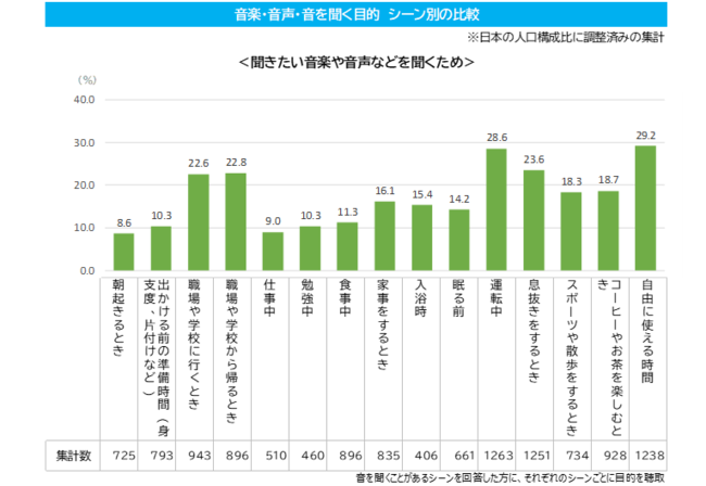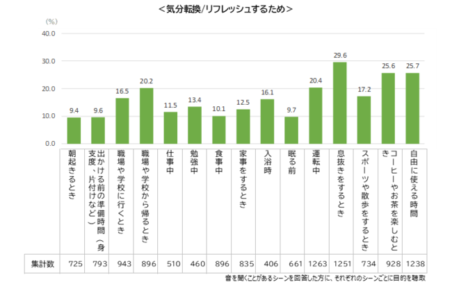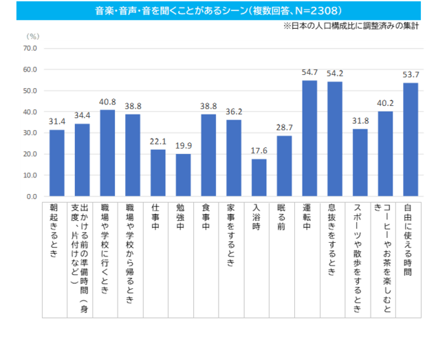 音楽・音声・音を意識して聞くことがあるシーンとして「運転中」「息抜きをするとき」「自由に使える