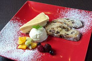 レーズンやクルミなどのドライフルーツをたっぷりと練りこみ焼き上げたドイツでクリスマスに食べられている定番のお菓子「シュトーレン」に、デザート2種を加え、ドリンクとセットにしたプレートです。