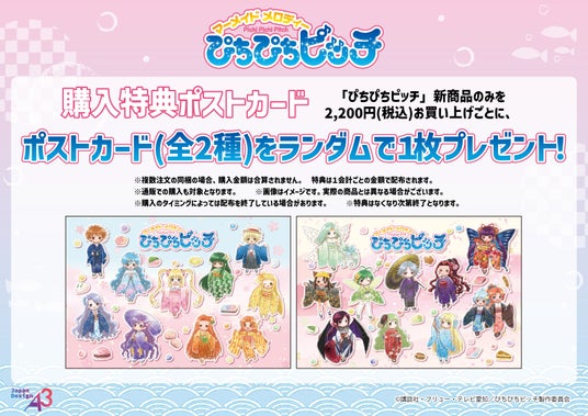 今回発売したTVアニメ『マーメイドメロディー ぴちぴちピッチ』の新作グッズのみを2,200円(税込)お買い上げごとに、ポストカード(全2種)をランダムで1枚プレゼントします。