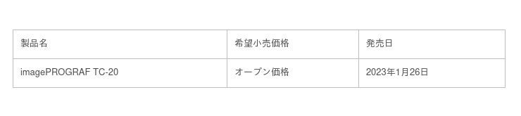 キヤノンは、大判インクジェットプリンター「imagePROGRAF(イメージプログラフ)」の4色顔料インクモデルの新製品として、キヤノン初のA1ノビ対応デスクトップ大判プリンター“TC-20”を2023年1月26日より発売します。