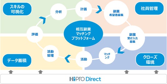 労働力不足を解決する手段の1つとして、副業人材の活用を、国を挙げて推進している一方、副業受け入れを経験したことのある企業は約3割に留まっています※2。この背景には「情報セキュリティ面での不安」や「受け入れのための仕組み(制度)が整っていないことによる不安」など、活用経験がないことから生じる不安の壁が存在します。そこで「HiPro」は、企業間が連携し、相互に人材を受け入れ・送り出す、会社公認の副業「相互副業プロジェクト」を始動※3。企業・副業者が安心して副業に取り組むことができ、多様な人材とスキルが確保できるとともに、社員と自社が成長することで、イノベーション創発、さらには人的資本経営の実現につながると考えています。この「相互副業」を実現するためのツールとして「相互副業マッチングプラットフォーム」を開発しました。