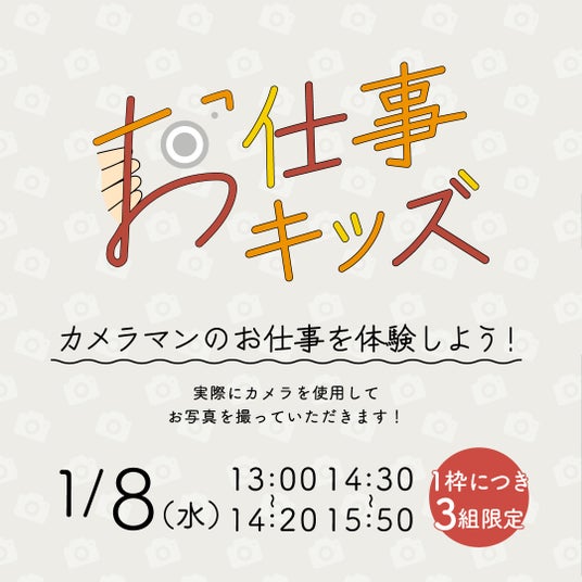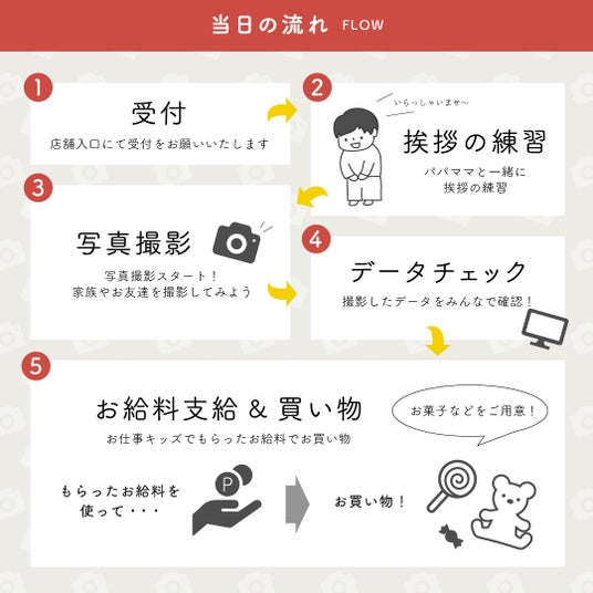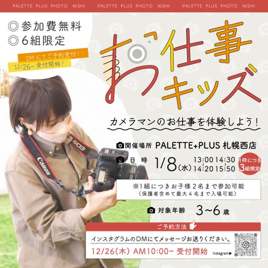 有限会社三景スタジオにて、地域のお子様との関わりを大切にした、社会福祉活動を行っております。今回はお客様としてではなく、ぱれっとの一員になってもらい実際にカメラマンとして働くことで『働くことの楽しさ』や『働くことの尊さ』を感じていただく為、『おしごとキッズ』イベントを開催いたします。お仕事を無事に終えた後はお給料が発生するので自分で頑張って稼いだお金でお買い物も楽しむこともできます。