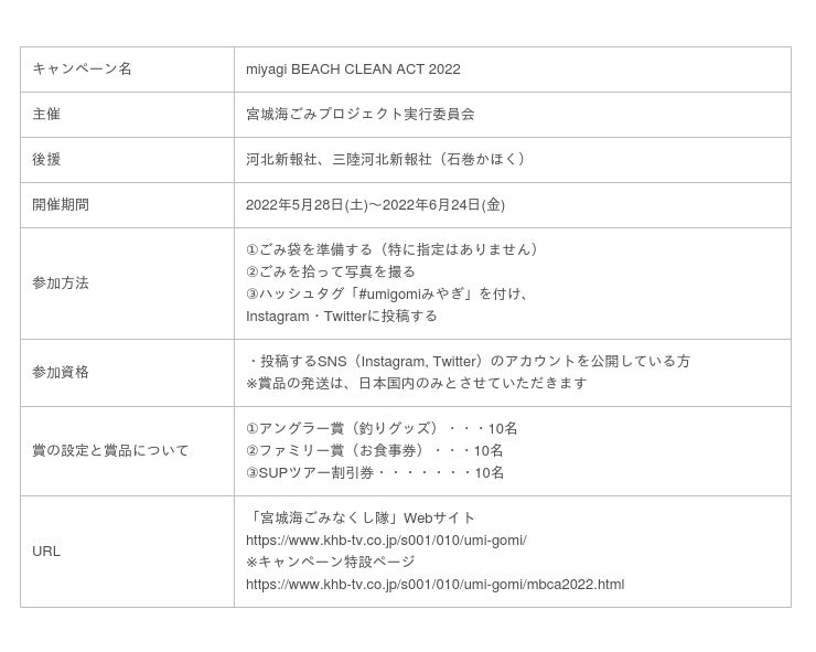 このキャンペーンは、参加者のごみ拾いの様子を「Instagram」「Twitter」いずれかのSNSに指定ハッシュタグ「#umigomiみやぎ」を付けて投稿するとエントリー完了となり、事務局審査によって決定する受賞者30名に、プレゼントが贈られるというフォトコンテストです。なお、エントリーされた投稿は随時、キャンペーンの特設Webページにて公開されました。