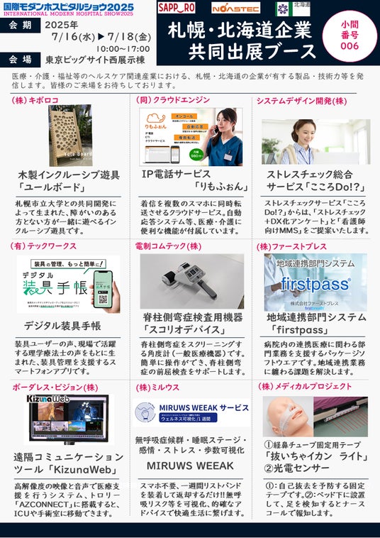 成長が見込まれるヘルスケア産業において、道内企業の医療・介護・福祉分野に関連する製品のPRや取引拡大を図るため、道では、札幌市、ノーステック財団との連携により、東京都で開催される展示会「国際モダンホスピタルショウ2025」に、札幌・北海道企業共同出展ブースを設け、道内企業9社とともに出展します。