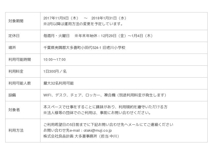 株式会社良品計画(東京都豊島区/代表取締役社長 松﨑曉)は、千葉県大多喜町旧老川小学校校舎にコワーキングスペースを開設いたします。2017年11月9日(木)~2018年1月31日(水)は1名につき1日300円でご利用いただけます。
