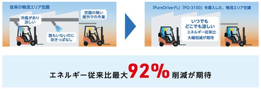 電動フォークリフトのバッテリーで8時間連続稼働させた場合のバッテリー消費割合はバッテリー容量の約2.5%(バッテリー容量48V/400Ahの場合)とわずか。また、PD-3100を導入する事でパーソナル空調化が実現するため、全体空調にした場合と比較してエネルギーの大幅な削減が期待できる試算結果が得られており、カーボンニュートラルへの貢献も期待できる。