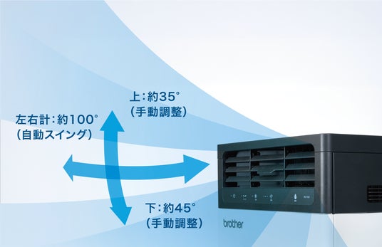 外気温より約4.1℃低い温度の風を、実使用地点(吹出口から1m)に届けることが可能(風量:中。外気温35℃/湿度50%時)。ルーバーは、従来型のPD-7100S(首振りモデル)の自動スイング角左右計80°を上回る100°*で、パワフルな涼風を広く届けることができる。