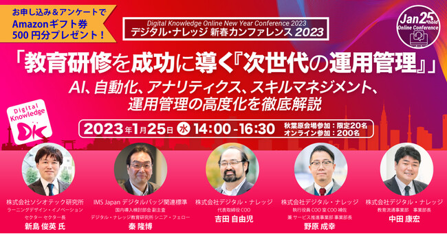 導入実績2000超を誇る 創業28年のeラーニング専門ソリューション企業、株式会社デジタル・ナレッジ(本社:東京都台東区、代表取締役社長:はが弘明)は、2023年1月25日(水)、デジタル・ナレッジ新春カンファレンス2023「教育研修を成功に導く『次世代の運用管理』」 (https://www.digital-knowledge.co.jp/online-conference/?prtimes)を開催致します。今回は、ソシオテック研究所さまをお招きした特別講演についてご案内します。