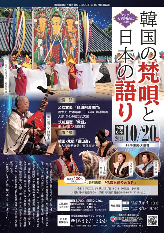 10月20日(日)企画公演 令和6年度(第79回)文化庁芸術祭主催公演アジア・太平洋地域の芸能~韓国の梵唄と日本の語り~日時:10月20日(日)14時開演
