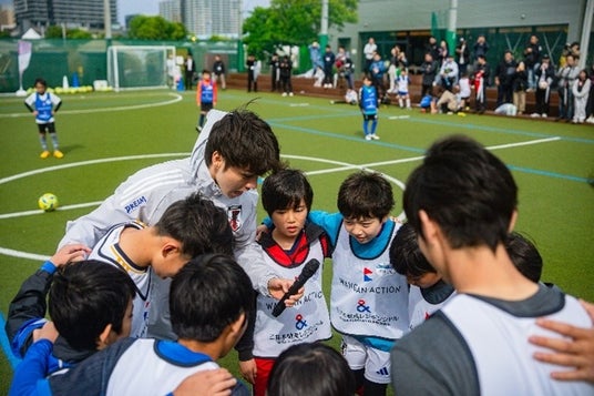 本イベントでは、ウォーミングアップを通した基本スキルの指導、サッカー日本代表選手との5vs1チャレンジやミニゲームを通じて、子どもたちがサッカー日本代表選手との交流を楽しみました。また、選手から自身の経験を交えたアドバイスもいただき、子どもたちにとって貴重な学びの場となりました。