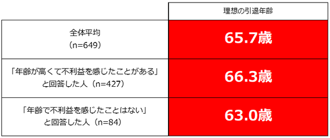 続いて「もしあなたが仕事から引退するとしたら、何歳くらいが理想ですか」と尋ねると、65歳以上と回答した人が7割を超えました。70歳以上と回答した人も3割を超えており、60歳定年の職場が一般的ではあるものの定年年齢を超えて働きたいと考える人が多くなっています。理想の引退年齢の平均は65.7歳でしたが、「年齢が高くて不利益を感じたことがある」と回答した人に絞ると66.3歳とさらに高くなりました。年齢の高さで不利益を感じたことがある人の方が、より高齢になるまで働きたいと考えているジレンマが伺えます。