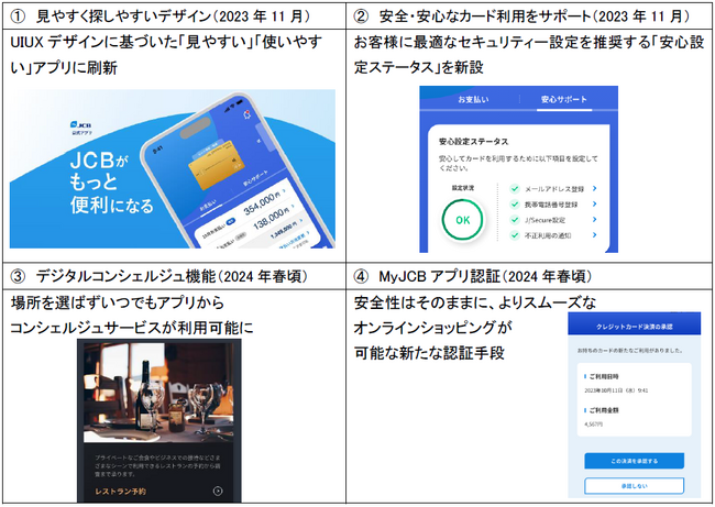 本リニューアルは、お客様により見やすく・情報を探しやすく使っていただくためのデザイン変更に加え、JCB として重要な価値の1つである「お客様の安全・安心」をより強化するため、先進的なアプリ機能を搭載します。具体的には、最適なセキュリティー設定を推奨する「安心設定ステータス」(2023 年11 月)、インターネットショッピングでの新たな認証手段「MyJCB アプリ認証」(2024 年春頃)を提供予定です。詳しくは以下をご覧ください。