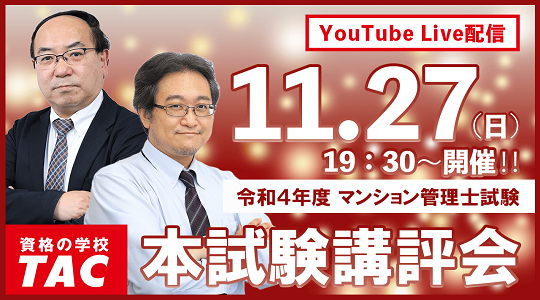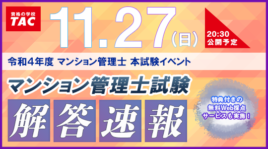 公認会計士や税理士など、数多くの国家資格や検定試験の受験指導といった教育事業を展開しているTAC株式会社(東京都千代田区、代表取締役:多田敏男)は、11/27(日)に実施される『令和4年度 マンション管理士試験』の解答速報を試験当日にTACのWebサイトで公開いたします。さらに、当日には『本試験講評会』も開催し、その模様をなんとLIVE配信いたします!スマートフォン・タブレット端末からもご視聴いただけますので、 ぜひ奮ってご覧ください!