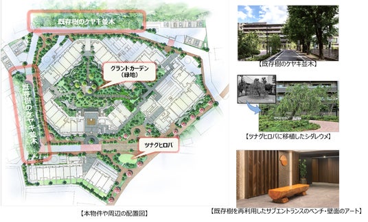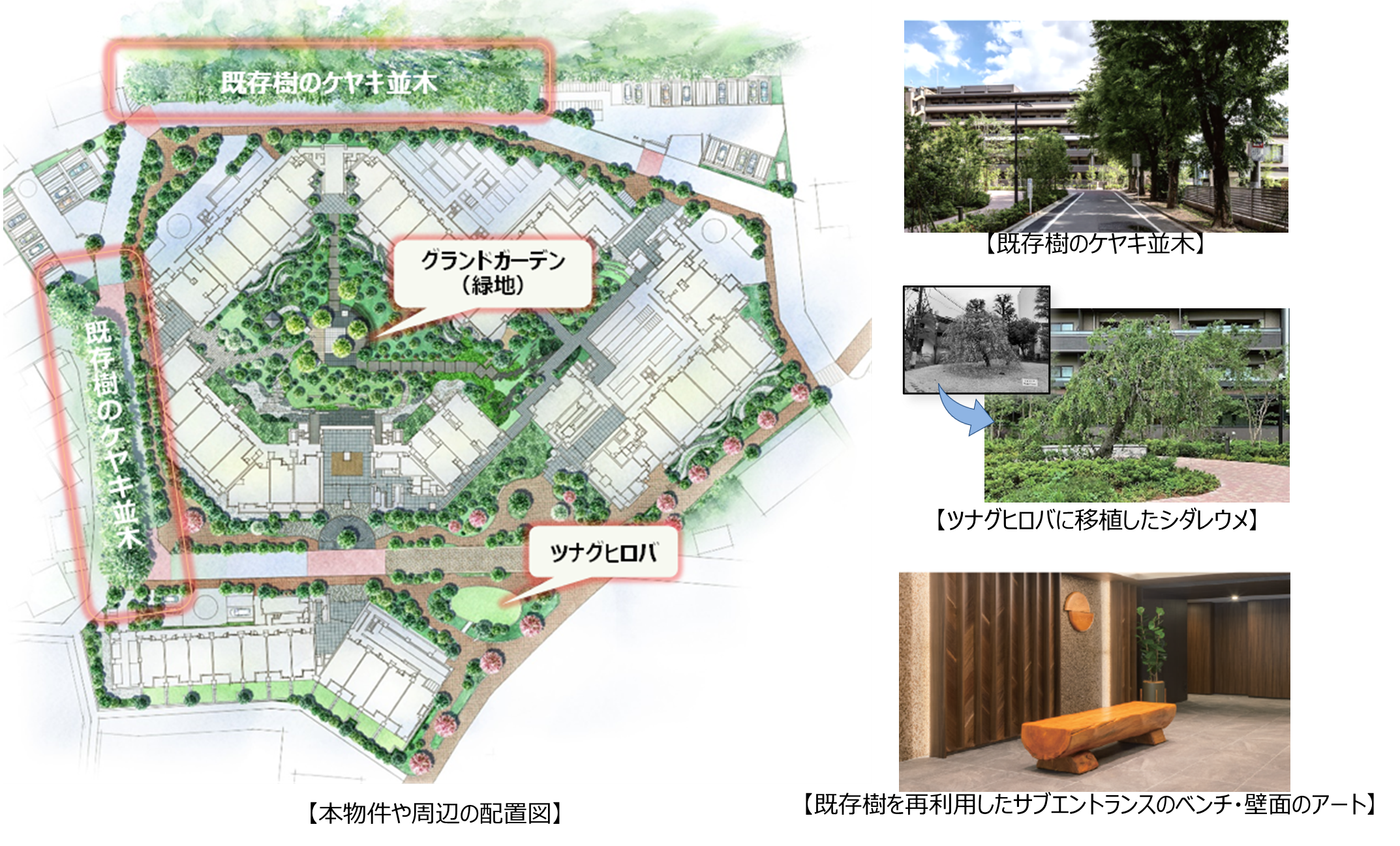 本物件は敷地面積約18,000平方メートル 、全500戸の大規模分譲マンションです。従前の建物は全246戸の団地で、敷地内には約50年間大切に育てられた桜、欅、杉、ユリの木など多様な樹木が多く生育していました。それらの樹木を団地の歴史として保存、再利用することに加え、従前団地に見劣りしない緑地緑量を備え、潤いある街づくり・都市の森づくりに取り組みました。