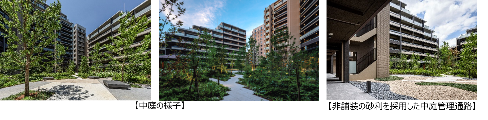 本物件には、舗装によって分断されていない、同じ景観が連続している緑地を、300平方メートル 以上確保しており、そのうち中庭に属する最大規模の緑地における構成樹木の半分以上が在来種となります。