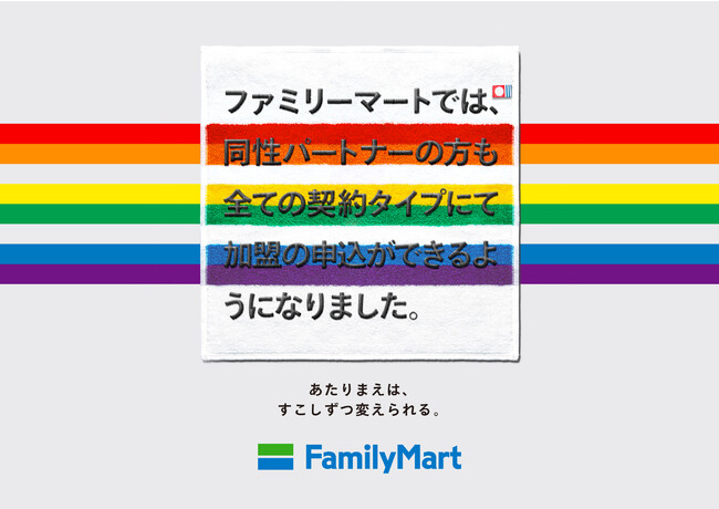 このたび、ファミリーマートへの加盟要件を変更し、「事実婚」「同性パートナー」においても法律上の夫婦と同様に全ての契約タイプにて加盟申込みが可能になりましたのでお知らせします。