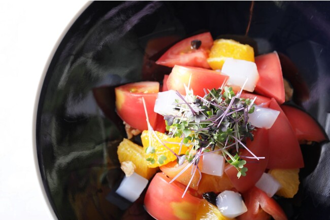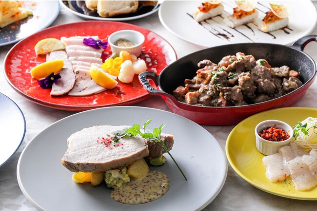 ■冷製料理:カンパチのマリネ 香味野菜と食べるラー油で/旬魚とタコのエスカベッシュ セロリとオリーブをのせて/2種のシャルキュトリーとピクルスの盛合わせ/完熟トマトとオレンジとナタデココのサラダ/愛知産のグリーンリーフサラダ ベイビィスタアとラスパドゥーラチーズ/つぶつぶコーンスープ