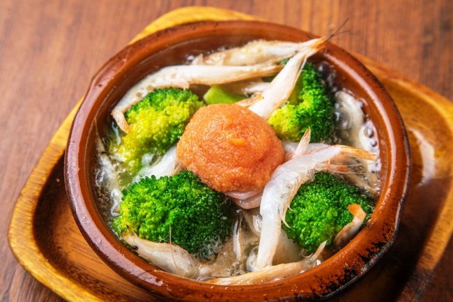 女性を中心に、ここ数年人気は衰える気配を見せないのがアヒージョ。この春特にオススメなのが、新鮮な白海老をメインに据えたこちらの一皿。食べ応えもありその緑色も美しいブロッコリーと、白海老&明太子の塩気は相性抜群です。